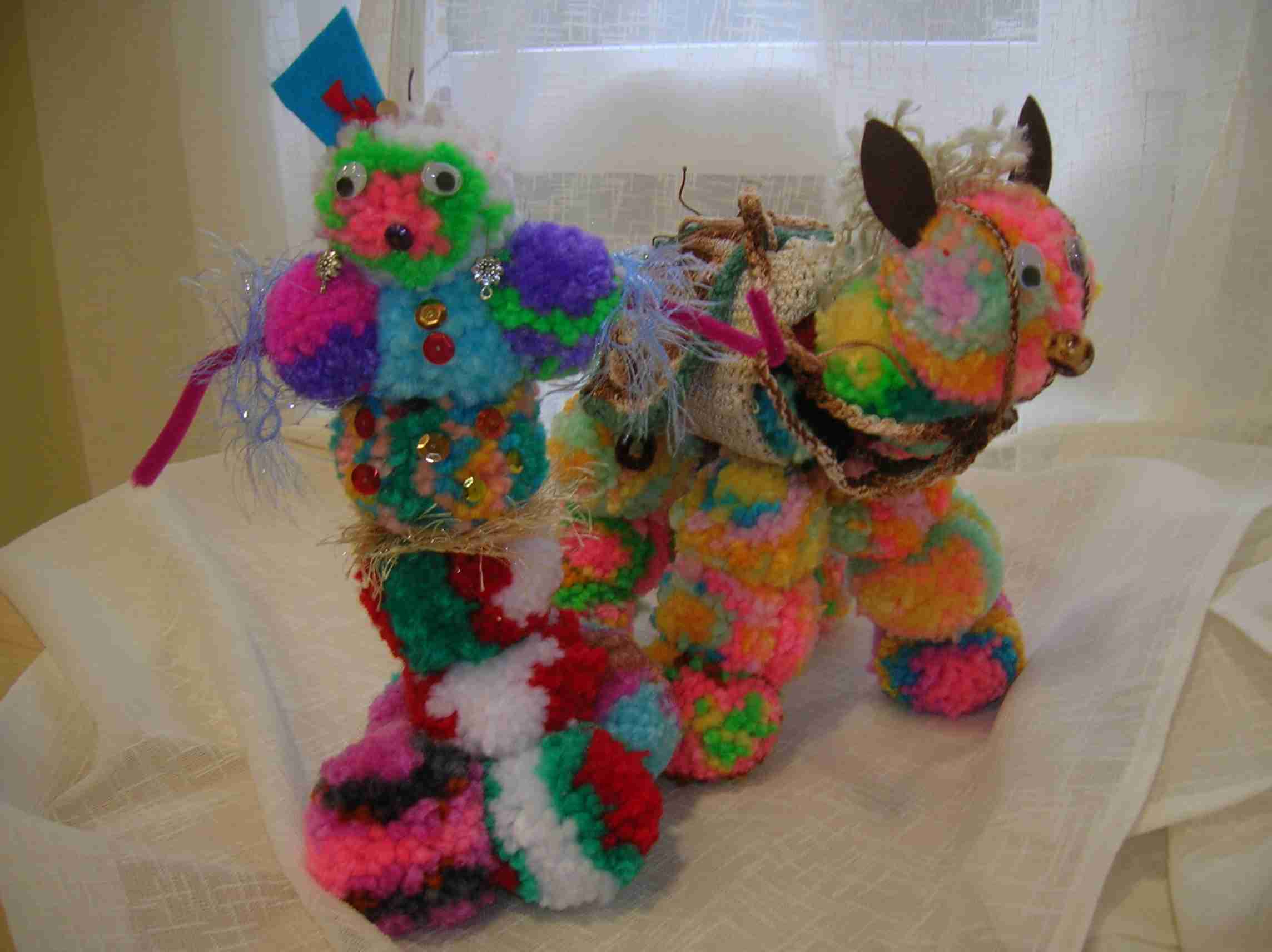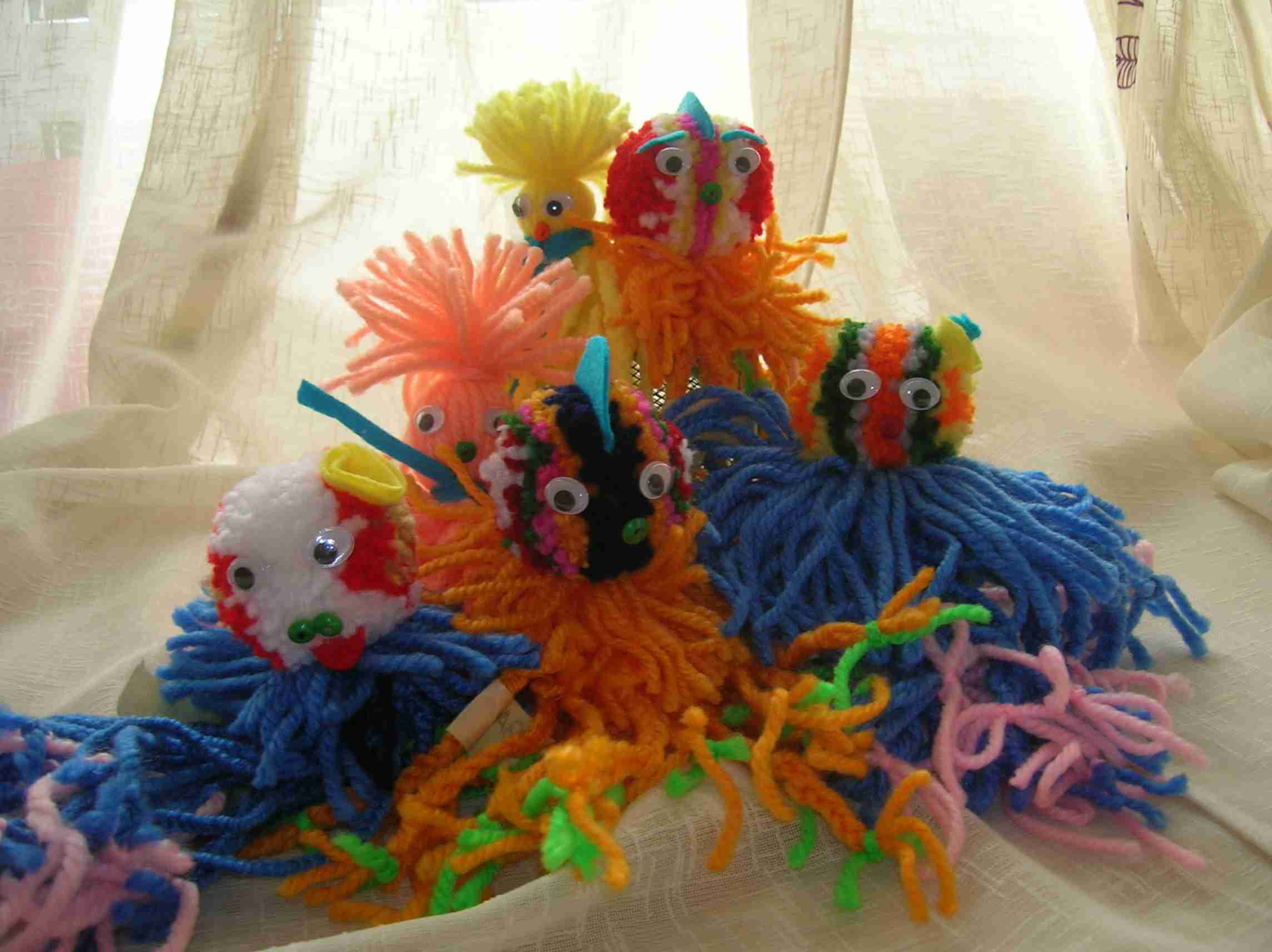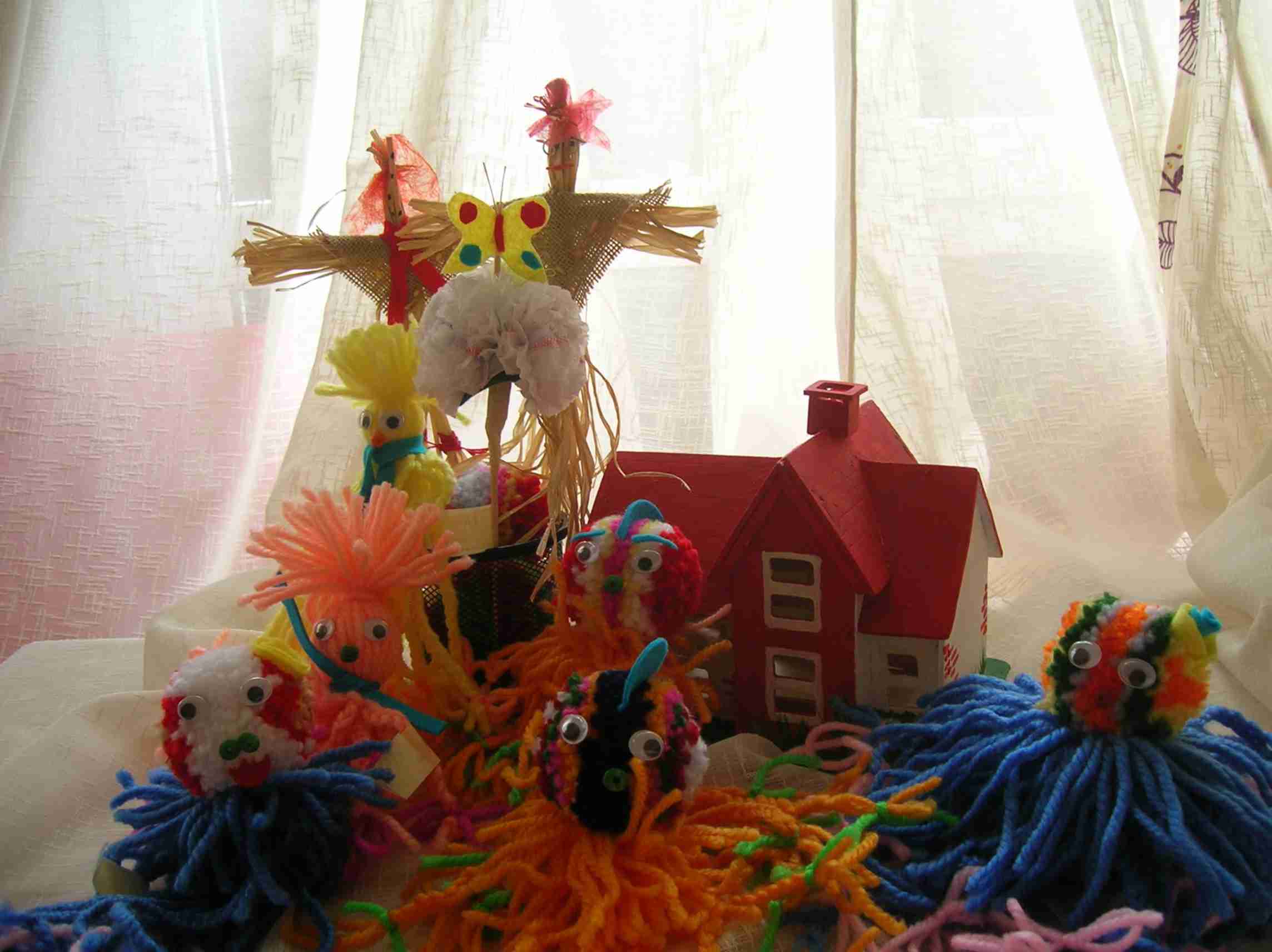 espantapájaros de paja, pulpos y medusas de lana, flores de fieltro y